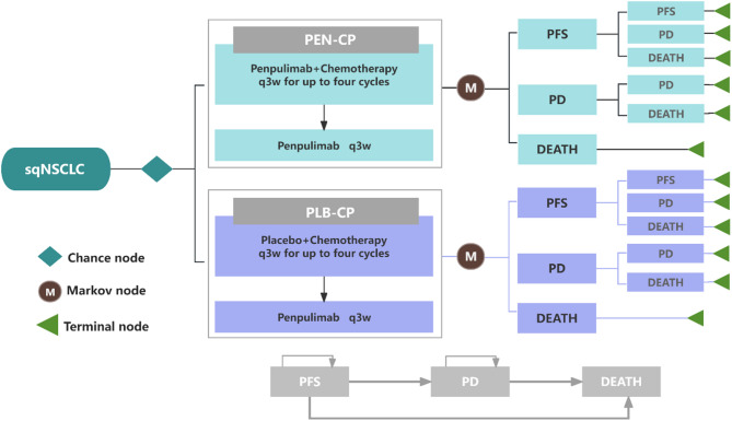 Methods: A three-state Markov model was developed to evaluate the cost-effectiveness of PEN-CP as a first-line treatment for metastatic sqNSCLC. Clinical efficacy data were sourced from the AK105-302 trial, while drug costs were derived from national tender prices. Additional costs and health utilities were obtained from published literature. The primary outcomes included total costs, quality-adjusted life years (QALYs), and incremental cost-effectiveness ratios (ICERs). To assess the robustness of the findings, both one-way and probabilistic sensitivity analyses were conducted.