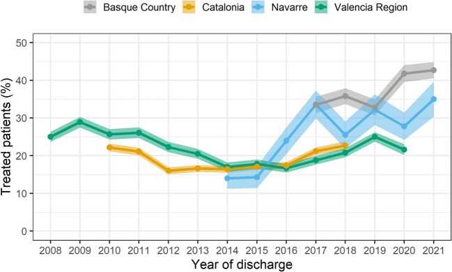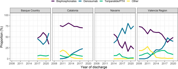 Methods: We constructed a population-based retrospective cohort of all patients aged 65 years + , discharged alive following hip fracture hospitalization (Jan 2008 to Dec 2021) in several regions of Spain, accounting for one third of the country's population. The proportion of patients prescribed any antiosteoporotic (AO) medication and specific classes in the first 90 days after discharge was evaluated. Temporal trends of treatment prescription per month were plotted. All analyses were performed also by age, sex, and region.