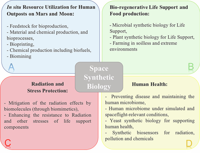 Human space exploration faces different challenges. Topics like Bioregenerative Life Support Systems, In Situ Resource Utilization, and radiation protection, still require for more suitable solutions to be applied in long-term space exploration. Synthetic biology could be a powerful tool for enabling human exploration of space and planets. This paper explores key topics including resource utilization, life support systems, radiation protection, and human health, providing recommendations for short-, mid-, and long-term advancements in space exploration.