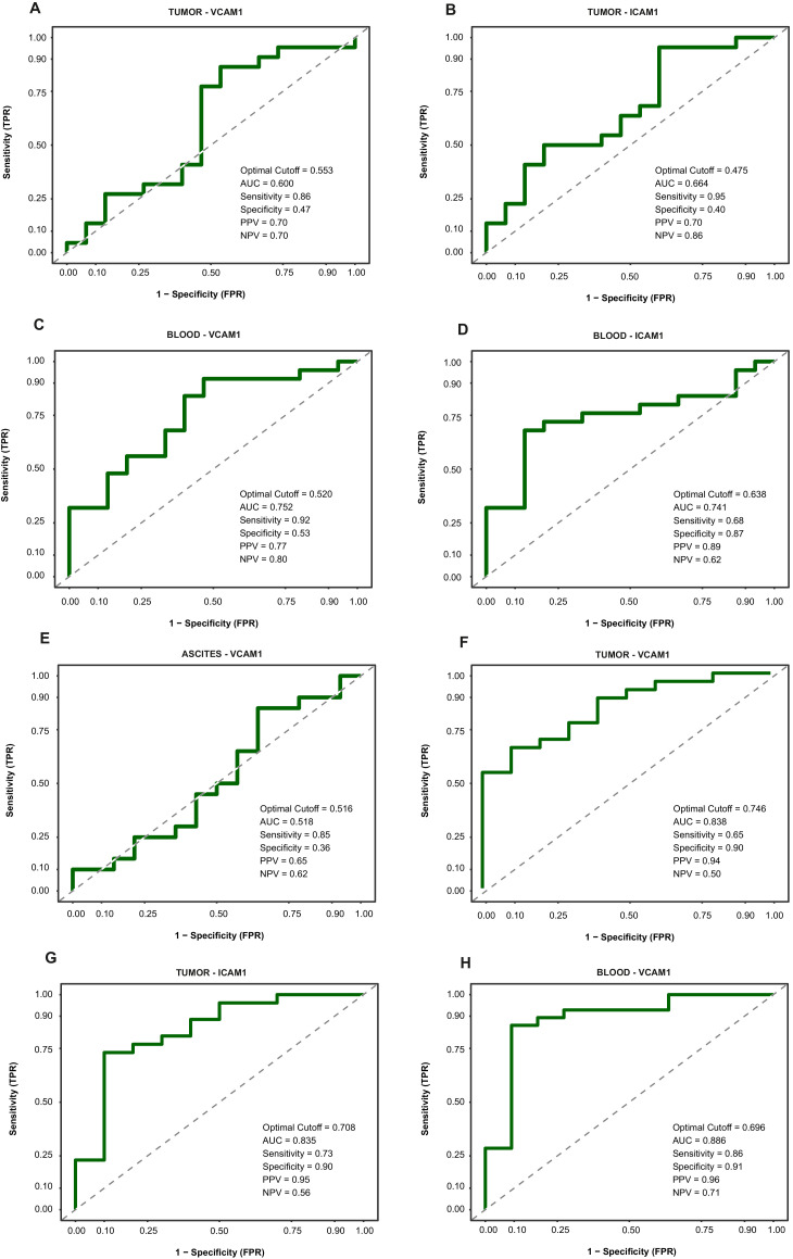 Methods: The Concentration of 10 inflammatory cytokines and 2 adhesion molecules concentrations were measured by Luminex based assay in blood, tumor tissue, and ascitic fluid samples from patients with advanced ovarian cancer prior to cytoreductive surgery. Clinical data were prospectively collected. Correlations between cytokines and adhesion molecules levels and surgical complexity, as well as disease/cancer recurrence, were assessed using Pearson two-tail statistical test analyses. The association between adhesion molecules and surgical extent, and recurrence was analysed using logistic regression yielding odds ratios (OR) with 95 % confidence intervals, adjusted for relevant covariates. The diagnostic accuracy of biomarker candidates was evaluated using receiver operating characteristic (ROC) curve analysis RESULTS: In blood, higher VCAM-1 and ICAM-1 levels correlated with lower surgical complexity scores, while ascitic VCAM-1 was linked to longer surgical durations. CXCL-12 in tumor and IL-32 in ascites were positively correlated with increased surgery duration, indicating their role in systemic inflammation. Elevated VCAM-1 and ICAM-1 levels in tumor tissue were strongly associated with increased cancer recurrence risk, suggesting their involvement in metastasis and immune evasion. Traditional preoperative markers, including albumin and CRP, did not correlate significantly with surgical complexity, highlighting the need for novel biomarkers. In the adjusted multivariable regression model, VCAM-1 in blood was associated with recurrence, OR 10.1 (95 % CI, 1.30-77.8; p=0.027). Similarly, VCAM-1 in blood demonstrated exceptional predictive capability, Area Under Curve=0.886 with cutoff point of 0.696.