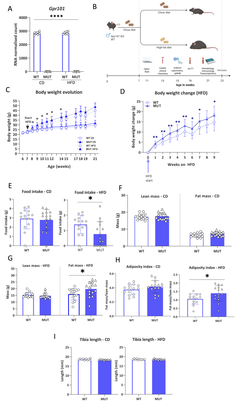 G-protein-coupled receptors (GPCRs) represent targets for improved low-side-effect therapies to tackle the evolving Western obesity epidemic. The orphan (o) GPCR GPR101 emerged as an attractive candidate in this regard. Expressed on cells in brain areas regulating energy homeostasis, including the hunger-suppressing proopiomelanocortin (POMC) + neurons, it is minimally expressed outside the brain. To understand the function of this receptor in vivo, we herein generated and comprehensively characterized a Gpr101 knockout mouse line, either under standard feeding conditions or with chronic high-fat diet (HFD) access (16 weeks). GPR101 loss accelerated the risk for diet-induced obesity (DIO), hyperinsulinemia and disrupted glucose homeostasis. Hypothalamic transcriptomic analysis revealed also decreased Pomc activation with HFD suggesting impaired hunger suppression. Moreover, on a standard diet, there was a molecular signature of downregulated tristetraprolin (TTP) interactome gene activation suggesting impaired inflammation resolution. On HFD, there was differential expression of genes involved in microglial phagocytosis and lipid metabolism. Morphometry revealed altered hypothalamic arcuate nucleus microglial morphology consistent with the transcriptomic profile. We discuss how the GPR101 specialized pro-resolving mediator (SPM) receptor capacity likely underlies the aberrant microglial function and contributes to DIO risk. Thus, this evidence shows that GPR101 is a potential therapeutic target for DIO through, among other factors, effects on hypothalamic inflammation resolution.