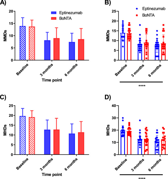 Results: Both eptinezumab and onabotulinumtoxinA demonstrated efficacy at 3 and 6 months, with no statistically significant differences between them for either primary or secondary endpoints. Both treatments had a more pronounced effect on MMDs and MHDs than on the reduction of intensity and disability, and reduced the need for rescue medications at 3 and 6 months. After 3 months, onabotulinumtoxinA displays a trend to reduce the need to rescue medication in a higher number of patients compared to eptinezumab.