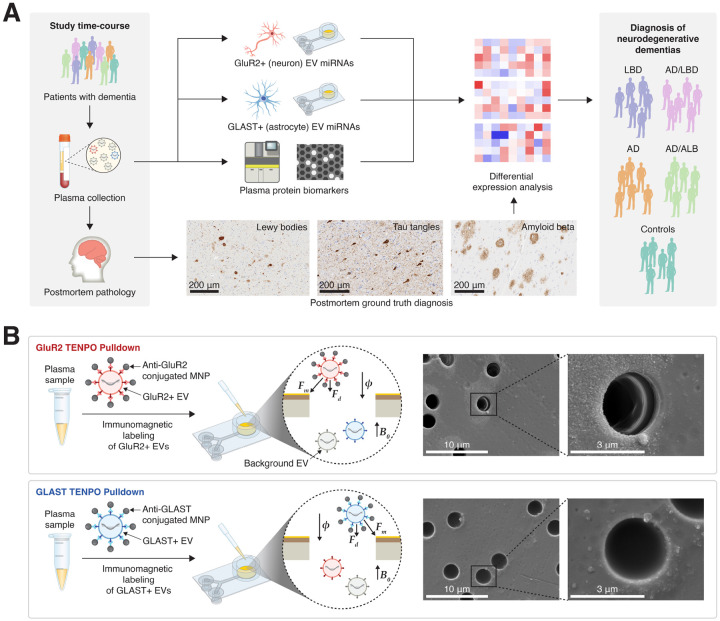 Methods: We analyzed plasma from 137 autopsy-confirmed patients [30 LBD, 31 AD, 30 AD/LBD, 19 AD with amygdala Lewy bodies (AD/ALB), and 27 controls], sequencing miRNAs from TENPO-isolated GluR2-positive (neuron-enriched) and GLAST-positive (astrocyte-enriched) EVs, and measuring plasma proteins (Aβ40, Aβ42, tau, p-Tau181, p-Tau231) via SIMOA.