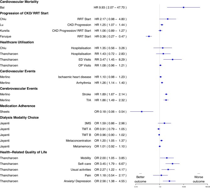 Results: Fourteen studies were included. Cognitive impairment was associated with increased all-cause and cardiovascular mortality, higher risk of cardiac arrhythmia, stroke and transient ischaemic attack, lower HRQoL, and higher healthcare utilization. Mixed results were seen in studies examining the association between cognitive impairment and kidney disease progression. No studies with self-management measures as an outcome were identified.