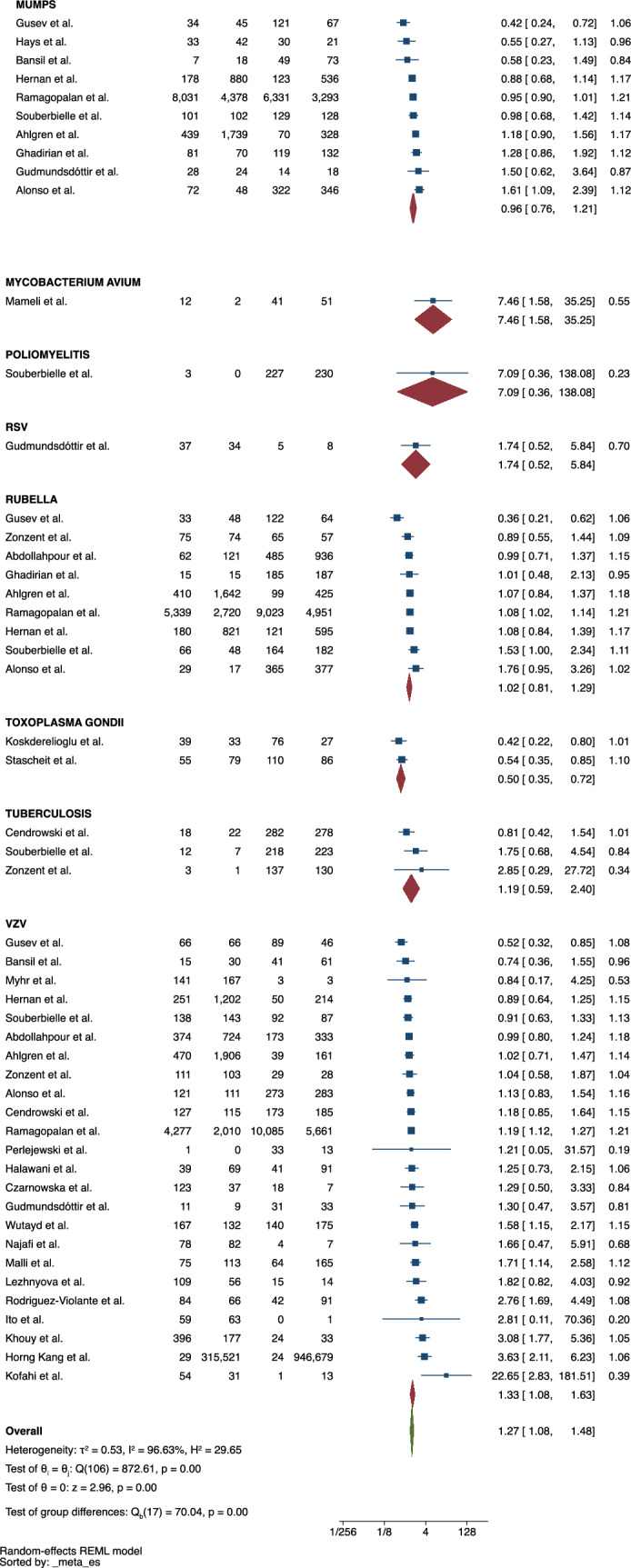 Results: One-hundred thirty-two publications met all the eligibility criteria and were included in the review. Overall, 109,626 people with MS and 16,724,390 controls from 38 countries were included in the review. A total of 42 environmental risk factors were investigated as potential risk factors for MS. Among the various statistically significant associations, the pooled ES revealed a direct association between serological evidence of contact with EBV (ES = 1.96, 95% CI = 1.53-2.51), herpes virus type 6 (HHV-6) (ES = 2.84, 95% CI = 2.08-3.89) and varicella-zoster virus (ES = 1.33, 95% CI = 1.08-1.63) and the occurrence of MS. Similarly, smoking was associated with a greater likelihood of having MS (ES = 1.43, 95% CI = 1.27-1.61). Vitamin D levels at any time were negatively associated with the proportion of cases of MS and had a moderate pooled ES (g = - 0.48, 95% CI = - 0.88-0.09). Adult BMI was not associated with MS.