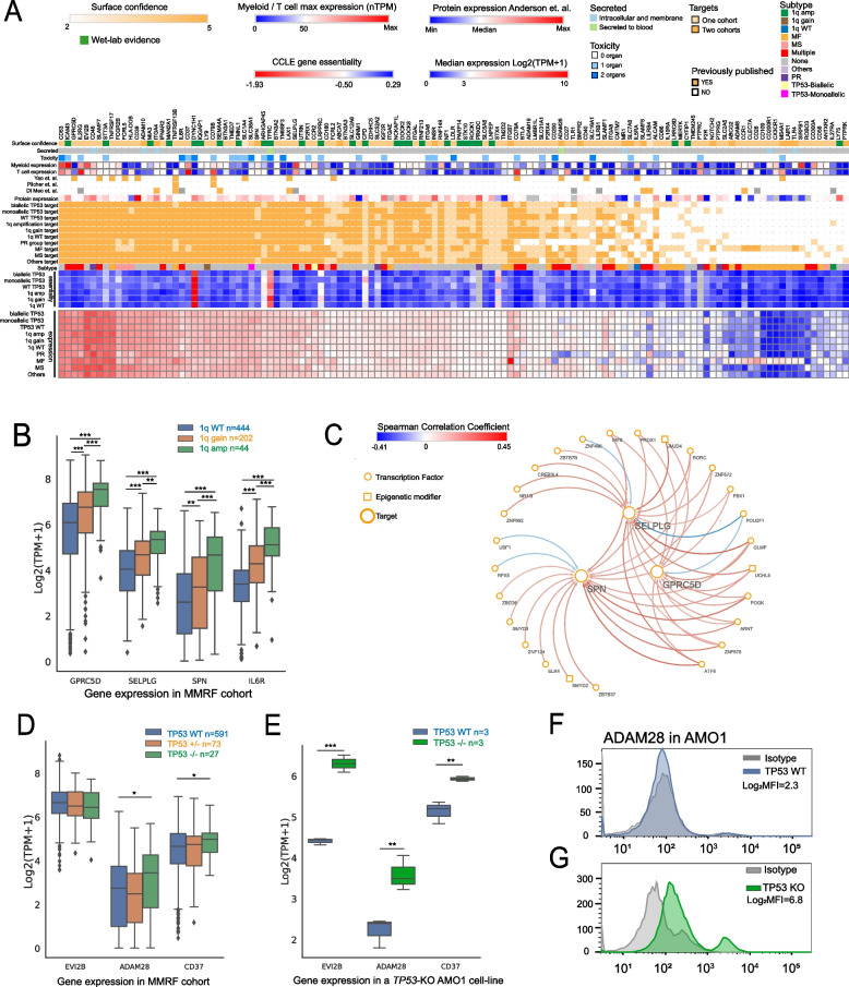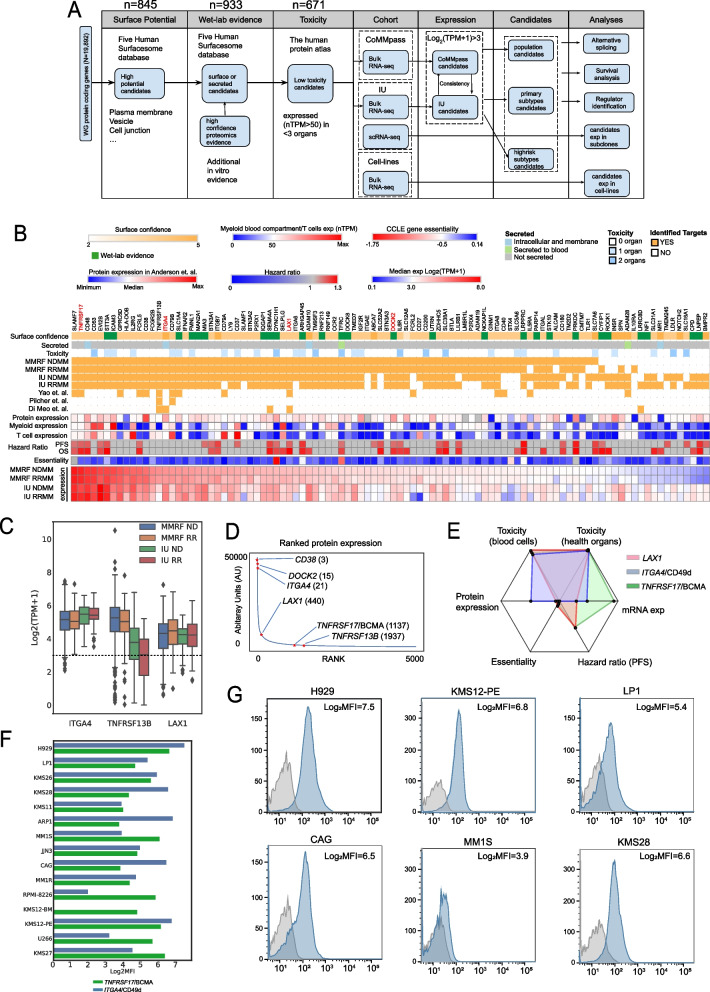 Methods: We utilized multi-omics data from two large datasets A framework that utilized prior knowledge of cell surface potential, expression in healthy organs, and expression level in MM cells was established to define novel immunotherapeutic targets. High confidence targets were prioritized for myeloma populations and subgroups, validated with flow cytometry and immunoblotting.