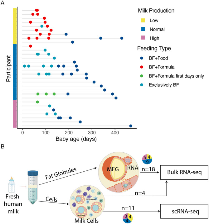 Breastfeeding is essential for reducing infant morbidity and mortality, yet exclusive breastfeeding rates remain low, often due to insufficient milk supply. The molecular causes of low milk production are not well understood. Fresh milk samples from 30 lactating individuals, classified by milk production levels across postpartum stages, were analyzed using genomic and microbiome techniques. Bulk RNA sequencing of milk fat globules (MFG), milk cells, and breast tissue revealed that MFG-derived RNA closely mirrors luminal milk cells. Transcriptomic and single-cell RNA analyses identified changes in gene expression and cellular composition, highlighting key genes (GLP1R, PLIN4, KLF10) and cell-type differences between low and high producers. Infant microbiome diversity was influenced by feeding type but not maternal milk supply. This study provides a comprehensive human milk transcriptomic catalog and highlights that MFG could serve as a useful biomarker for milk transcriptome analysis, offering insights into the genetic factors influencing milk production.