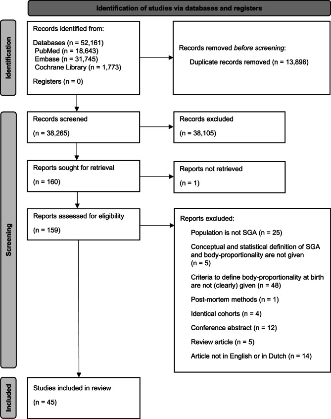 Methods: A scoping review was conducted using PubMed, Embase and the Cochrane Library databases. Studies were included if they described SGA newborns regardless of gestational age and if their classification on body-proportionality was given for both aSGA and sSGA. Data were screened and extracted by two independent reviewers.