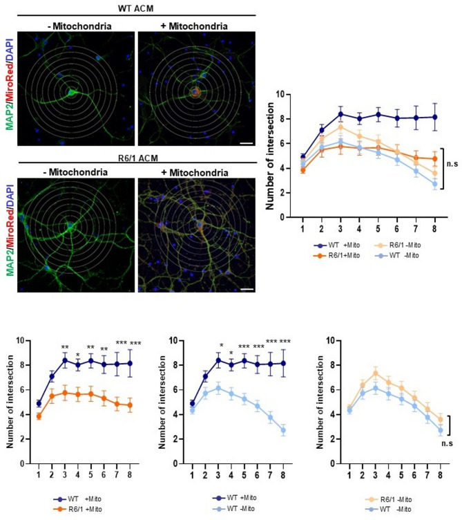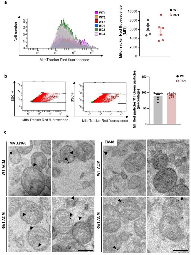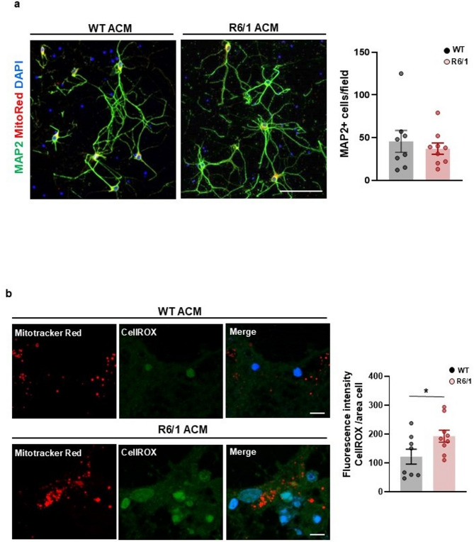 Methods: Primary striatal astrocytes were obtained from wild-type and R6/1 mice to investigate mitochondrial dynamics. Expression levels of key mitochondrial fusion and fission proteins were quantified by Western blotting and RT-PCR. Mitochondria morphology, oxidative stress and membrane potential were assessed using confocal microscopy following staining with mitochondria-specific dyes. Mitochondrial respiration was measured using the Oxygraph-2k respirometer system (Oroboros Instruments). Transmitophagy was evaluated by confocal imaging after labeling astrocytic mitochondria with Mitotracker dyes. To assess the functional impact of mitochondrial transfer on neurons, Sholl analysis, neuronal death and oxidative stress levels were quantified using specific fluorogenic probes.