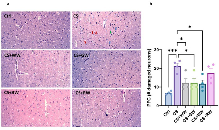 Chronic stress has been linked to significant cognitive impairments, which are exacerbated by oxidative stress and neuronal damage in brain regions such as the hippocampus and prefrontal cortex. This study investigates the therapeutic effects of different visible light wavelengths (white, red, green, and blue) on cognitive dysfunction and oxidative stress in a chronic unpredictable mild stress (CUMS)-induced rat model using stressors such as cold-water swimming, tail pinching, food and water deprivation, cage tilting, shaking, continuous illumination, wet cages, heat stress, and restraint. Sixty male Wistar rats were divided into control, CUMS, and light-exposure groups. The light-exposed groups received daily exposure to white (3000 lx), red (650 nm, 1300 lx), green (530 nm, 1300 lx), or blue (460 nm, 1300 lx) light for four hours over four weeks. Behavioral assessments were conducted to evaluate memory and depression-like behaviors. Biochemical analyses were performed to measure oxidative stress markers, acetylcholinesterase (AChE) activity, and serum corticosterone levels. Results showed that chronic stress significantly impaired cognitive function, increased oxidative stress, elevated AChE activity, and serum corticosterone level. Red light exposure had no significant effect on any of the evaluated parameters. However, Light exposure, particularly blue light, mitigated these effects by reducing reactive oxygen species (ROS), malondialdehyde (MDA), and nitrite levels, while enhancing total antioxidant capacity (TAC), superoxide dismutase (SOD) activity, and glutathione (GSH). Behavioral outcomes also improved, with increased memory performance and reduced depressive behaviors in light-treated groups. Histological analyses revealed decreased neuronal damage in the hippocampus and prefrontal cortex following light therapy. These findings suggest that visible light exposure, especially blue light, may serve as a promising non-invasive intervention for stress-induced cognitive impairments by reducing oxidative stress and neuronal damage.