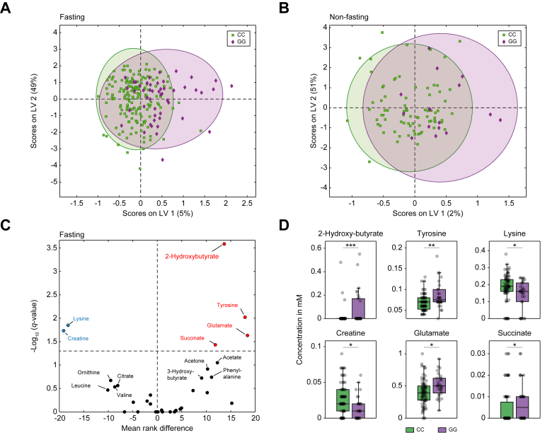 Results: PNPLA3 GG displayed a distinct metabolic profile, with notable alterations between fasting and non-fasting states. During the latter, GG carriers showed lower levels of VLDL-1, reflecting impaired triglyceride (TG) efflux from hepatocytes. Following an overnight fast, GG carriers exhibited higher tricarboxylic acid cycle metabolites and ketone bodies, overall indicating increased β-oxidation likely attributed to lower PNPLA3 expression, facilitating unrestricted adipose triglyceride lipase activity and consecutive increased hepatic TG secretion. In addition, the ketogenic amino acid lysine, critical for mitochondrial carnitine transport, was significantly reduced (GG 0.14 0.09 mM vs. CC 0.18 0.08 mM, q = 0.015). Consistently, TGs were enriched in LDL and HDL particles, and an increased number of intermediate-density lipoproteins emerged as a distinct marker in fasted GG carriers (GG 202.9 68.2 mg/dl vs. CC 160.8 65.6 mg/dl, q = 0.007). These metabolic changes were enhanced in patients with type 2 diabetes mellitus and/or obesity.