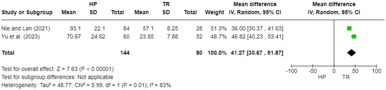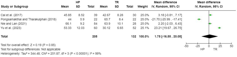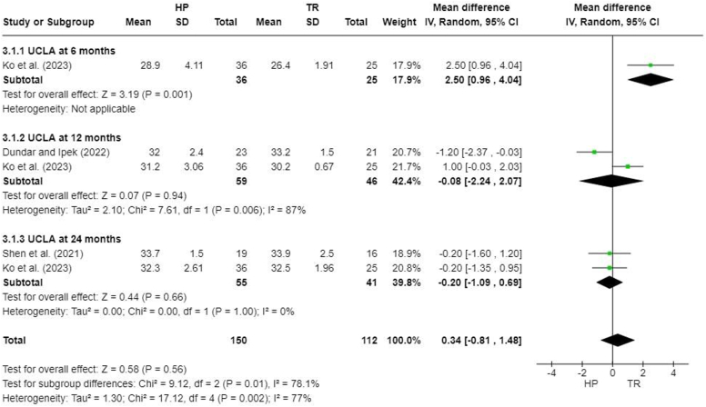 Results: The literature search yielded 221 studies, of which 12 studies enrolling a total of 683 patients were included in this review, with 371 in the HP group and 312 in the TR group. Meta-analysis of comparative studies between HP and TR fixation showed that HPs had better Constant-Murley scores (mean difference (MD), -3.56; 95% confidence interval (CI), -5.37 to -1.75; P = .0001), and less intraoperative blood losses (MD, 41.27; 95% CI, 30.67-51.87; P < .00001). Conversely, TR fixation had better visual analog scale scores (MD, 0.55; 95% CI, 0.34-0.76; P < .0001), and shorter postoperative CCD (MD, 0.45; 95% CI, 0.19-0.71; P = .0008). There was no significant difference in operative time (MD, 1.75; 95% CI, -16.55-20.05; P = .85), University of California, Los Angeles shoulder scores (MD, 0.34; 95% CI, -0.81 to 1.48; P = .56), American Shoulder and Elbow Surgeons scores (MD, 0.39; 95% CI, -0.90 to 1.68; P = .55), and complications (OR, 2.57; 95% CI, 1.00-6.62; P = .05).