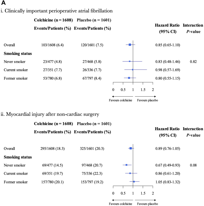 Results: A total of 687 (21.4%) were current smokers, 1577 (49.1%) were former smokers, and 945 (29.5%) were never smokers. AF occurred in 7.7%, 7.6%, and 5.3%, and MINS occurred in 21.0%, 19.7%, and 17.6% of current, former, and never smokers, respectively. Compared to never smokers, the adjusted hazard ratio for AF was 1.72 (95% confidence interval [CI] 1.07-2.77, P = 0.02) in current smokers and 1.46 (95% CI 0.99-2.16, P = 0.06) in former smokers, and the adjusted hazard ratio for MINS was 1.16 (95% CI 0.87-1.54, P = 0.32) in current smokers and 1.02 (95% CI 0.81-1.28, P = 0.88) in former smokers. No interaction occurred between smoking status and colchicine allocation for AF (interaction P, 0.82) or MINS (interaction P, 0.08).