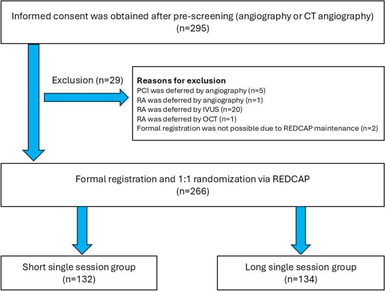 Slow flow is the most common complication of rotational atherectomy (RA). Compared with long single sessions, short single sessions may reduce the incidence of slow flow just after RA. This study aimed to compare the incidence of slow flow just after RA between short single session and long single session strategies. This multicenter, 1:1 randomized clinical trial was conducted at 3 hospitals in Japan. The short single session strategy was defined as repeating short single sessions (up to 15 s) of RA, whereas the long single session strategy was defined as repeating long single sessions (20-30 s) until the burr crossed the target lesion. The primary outcome was slow flow just after RA, which was defined as [(initial TIMI-frame count before RA) × 1.1 minus (TIMI-frame count just after RA)] less than 0. During the study period, 266 patients were included in the final study population and were randomly assigned to the Short single session group (n = 132) or the long single session group (n = 134). The protocol adherence rate was equally high in both groups (Short single session: 98.5% versus long single session 94.8%, p = 0.172). The incidence of slow flow just after RA was similar between the 2 groups (short single session:14.4% versus long single session: 14.9%, p > 0.999). In conclusion, this randomized trial did not show a benefit of the short single session strategy compared with the long single session strategy in RA with respect to the prevention of slow flow (Unique identifier: UMIN000047231).