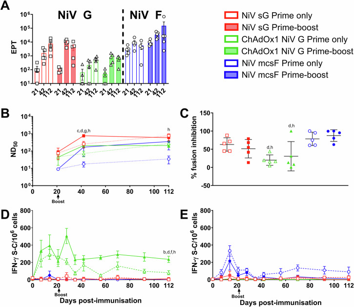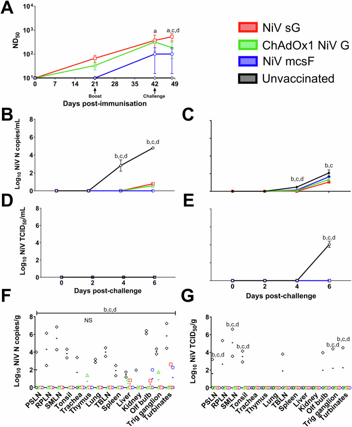 Nipah virus (NiV) causes a severe neurological disease in humans. The first NiV outbreak, in Malaysia, involved pig-to-human transmission, that resulted in significant economic losses to the local pig industry. Despite the risk NiV poses to pig-dense regions, no licensed vaccines exist. This study therefore assessed three NiV vaccine candidates in pigs: (1) adjuvanted soluble NiV (s)G protein, (2) adjuvanted pre-fusion stabilised NiV (mcs)F protein, and (3) adenoviral vectored NiV G (ChAdOx1 NiV G). NiV sG induced the strongest neutralising antibody response, NiV mcsF induced antibodies best able to neutralise cell-cell fusion, whereas ChAdOx1 NiV G elicited CD8+ T-cell responses. Despite differences in immunogenicity, prime-boost immunisation with all candidates conferred a high degree of protection against NiV infection. Follow-up studies demonstrated longevity of immune responses and broadly comparable immune responses in Bangladeshi pigs under field conditions. These studies provide a platform for developing a NiV vaccine for pigs.