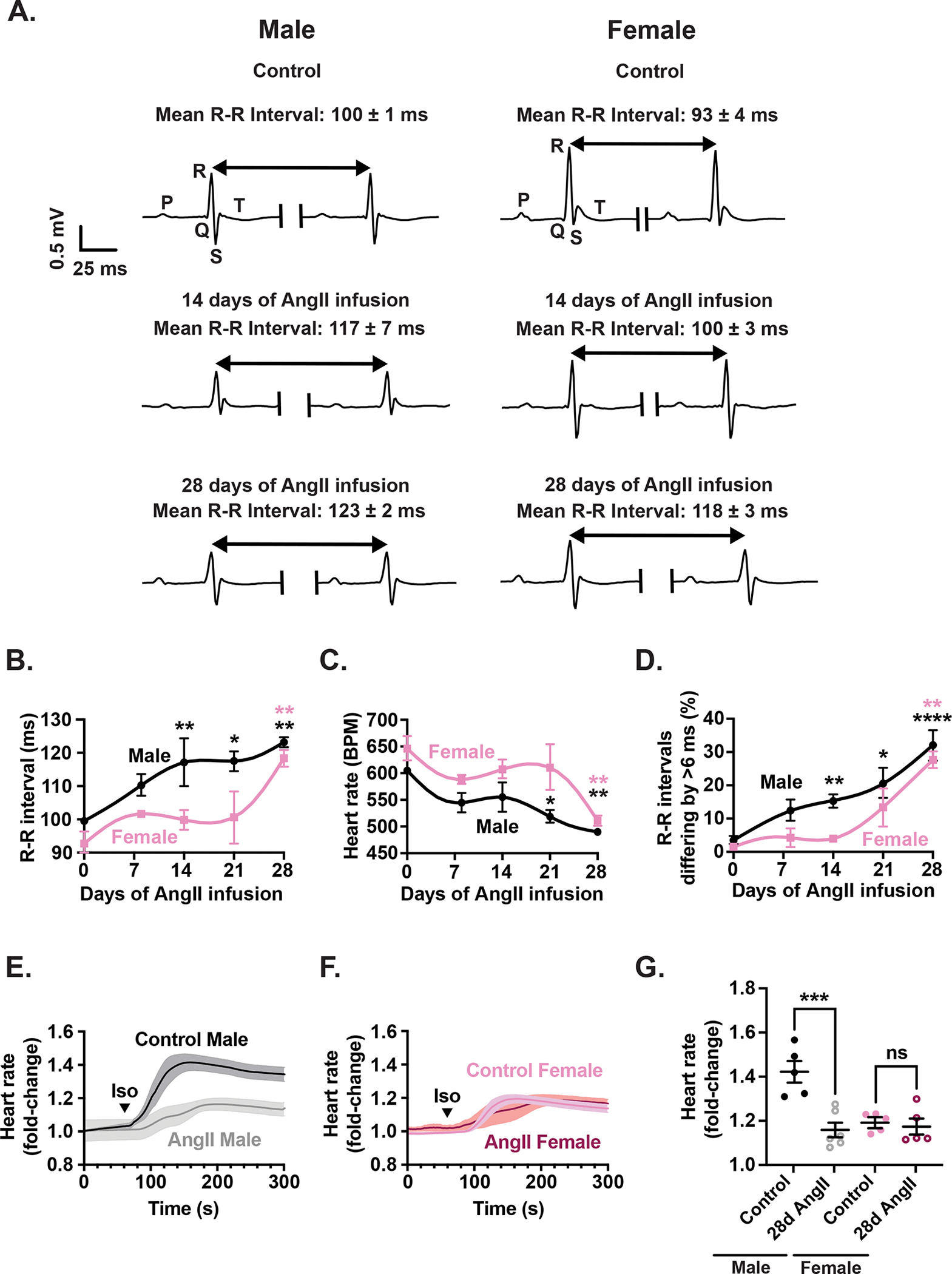 Results: Heart rate declined progressively during AngII infusion, with males falling from 605 ± 6 beats/min to 490 ± 6 beats/min and females from 646 ± 23 beats/min to 511 ± 10 beats/min by day 28. Bradycardia was accompanied by increased beat-to-beat variability: the percentage of consecutive heartbeats that differed in duration by >6 milliseconds increased from 3.5% ± 1.3% to 32.1% ± 4.5% in males and from 3.8% ± 1.1% to 27.7% ± 2.5% in females. These changes coincided with reduced microvessel density in the superior SA node (males: 6.1 ± 0.5 nm/μm3 to 3.9 ± 0.2 nm/μm3; females: 5.6 ± 0.4 to 2.8 ± 0.5 nm/μm3), whereas vessels in the inferior SA node remained unchanged. Despite preserved myocyte density, these changes were accompanied by up-regulation of oxidative stress and the hypoxia-inducible factor 1α and vascular endothelial growth factor signaling pathways.