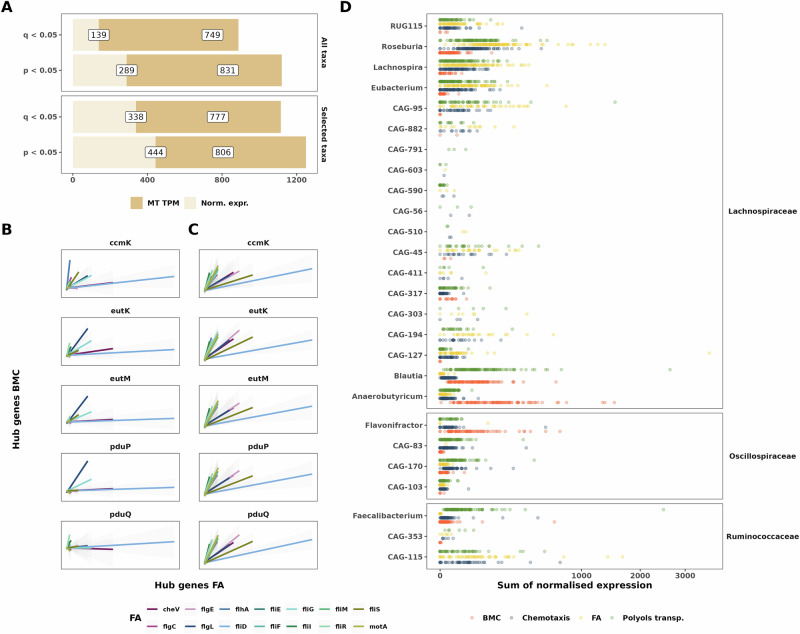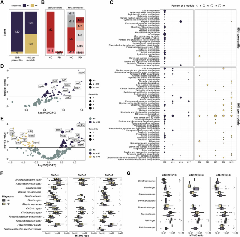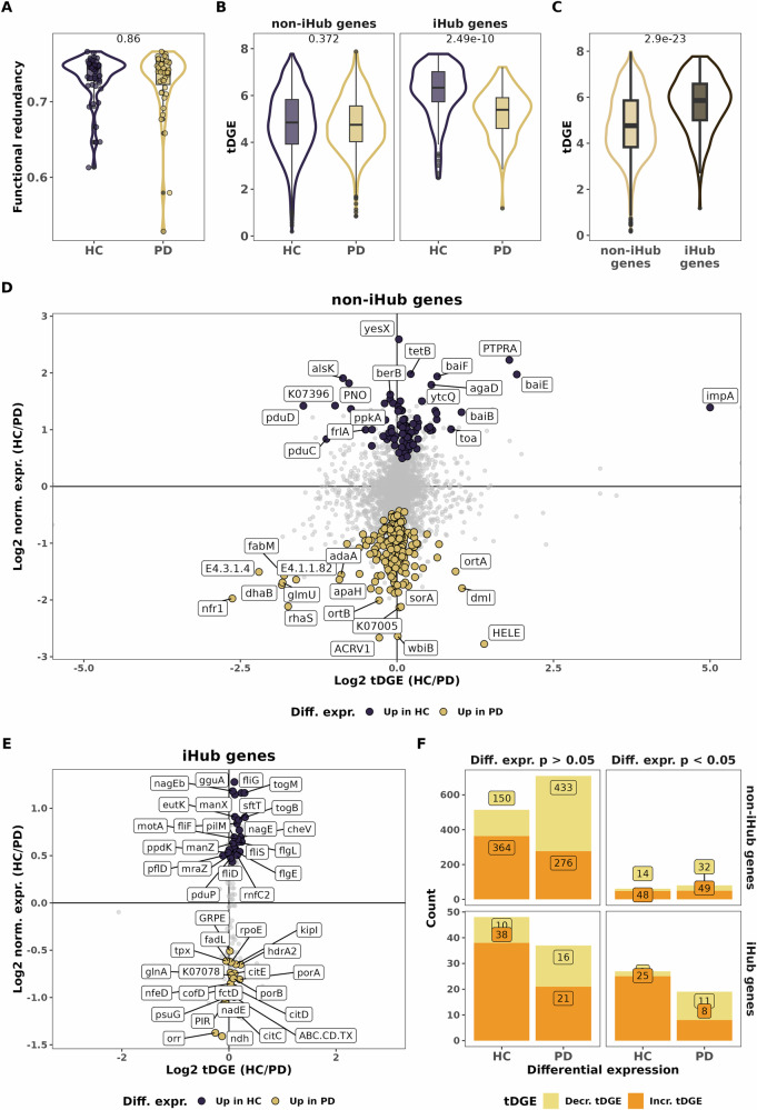 Gut microbiome alterations are linked to various diseases, including neurodegeneration, but their ecological and functional impacts remain unclear. Using integrated multi-omics (metagenomics and metatranscriptomics), we analyse microbiome gene co-expression networks in Parkinson's disease (PD) and healthy controls (HC). We observe a significant depletion of hub genes in PD, including genes involved in secondary bile acid biosynthesis, bacterial microcompartments (BMCs), polysaccharides transport and flagellar assembly (FA). Blautia, Roseburia, Faecalibacterium and Anaerobutyricum genera are the main contributors to these functions, showing significantly lower expression in PD. Additionally, we identify a strong correlation between BMC and FA expression, and an apparent dysregulation in cross-feeding between commensals in PD. Finally, PD also exhibits reduced gene expression diversity compared to HC, whereby higher gene expression correlates with greater diversity. We identify disruptions in gut metabolic functions, at both taxonomic and functional level, and microbiome-wide ecological features, highlighting targets for future gut microbiome restoration efforts.