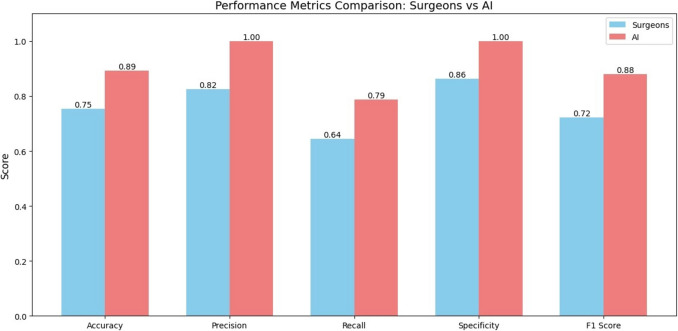 Results: The AI achieved a score of 0.75, exceeding the highest individual clinician score (0.68; median: 0.50), with statistical significance (p < 0.001). AI performed better in questions involving anatomical and technical information, while clinicians excelled in scenarios requiring practical judgment. Confusion matrices revealed higher true correct and true incorrect rates for AI, demonstrating perfect precision and specificity scores with no hallucinations detected.