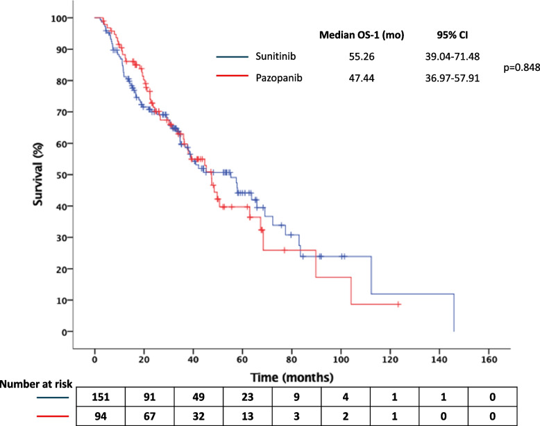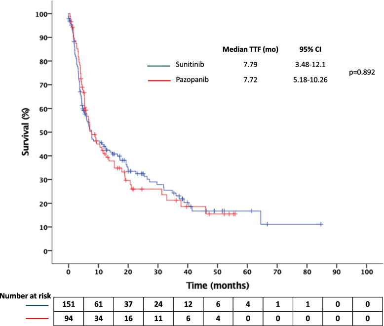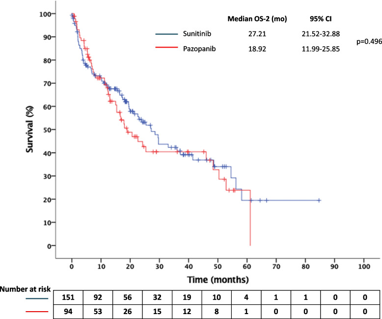 Results: A total of 245 patients who were treated with sunitinib or pazopanib monotherapy as first-line treatment followed by nivolumab as second-line treatment were included in this study. Median TTF following nivolumab initiation was similar between prior sunitinib and pazopanib groups (7.79 vs 7.72 months; p = 0.892). Median OS-2 was 27.21 months with prior sunitinib and 18.92 months with prior pazopanib (p = 0.496). In patients with sarcomatoid features (n = 20), those pretreated with pazopanib demonstrated numerically longer OS-2 compared to sunitinib (p = 0.023), although the small sample size limits definitive conclusions.