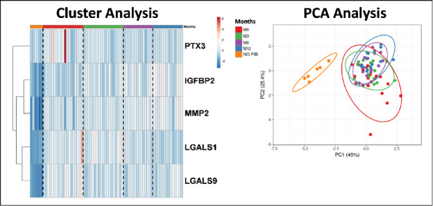Progressive fibrosing interstitial lung diseases (PF-ILDs) are characterized by persistent progression and have limited treatment options. The identification of reliable biomarkers to monitor fibrosis and therapeutic response remains a clinical challenge. This study investigated circulating plasma biomarkers associated with PF-ILDs and their potential role in monitoring disease evolution during nintedanib treatment. From 127 putative fibrosis biomarkers, seven candidates were identified with high diagnostic value (area under the curve [AUC] > 0.7), of which five (IGFBP2, PTX3, LGALS1, LGALS9, and MMP2) showed significant dynamic changes (assessed by longitudinal plasma proteomic analysis) in PF-ILD patients treated with 12-months nintedanib, correlating with improvements in forced vital capacity and diffusing capacity of the lung for carbon monoxide. Principal component analysis identified a shift in molecular profiles over time, suggesting nintedanib-induced modulation of these biomarkers. Receiver operating characteristic analysis demonstrated that while LGALS9 maintained a stable predictive value during nintedanib treatment, LGALS1, IGFBP2, PTX3, and MMP2 exhibited increasing AUC scores, indicating their potential role in monitoring fibrosis progression. We also identified optimal biomarker cut-off values at 12 months, which may provide reliable thresholds for fibrosis assessment. In conclusion, our exploratory analysis identified five biomarkers whose plasma concentrations changed during antifibrotic treatment, highlighting their potential prognostic value. Further validation in larger cohorts is needed to confirm their clinical utility.