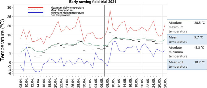 Conclusion: A good overview regarding the suitability of the tested genotypes for early sowing was obtained due to the large diversity investigated in this study, with surprisingly high survival rates of numerous genotypes after frost stress. These results will contribute to the breeding of cultivars with improved cold and frost tolerance, facilitating better adaptation for production in high-latitude temperate areas, as well as earlier sowing to avoid summer drought.