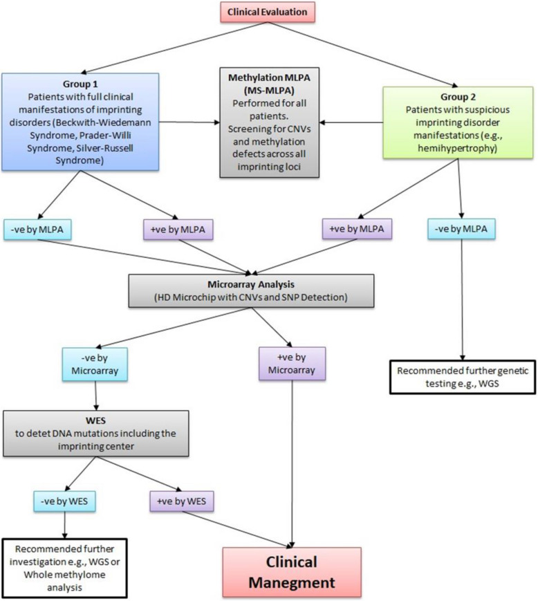 Methods: Fifty-three patients, either clinically evaluated for Impaired Disposition (ImpDis) or suspected to have it, were referred from the outpatient genetic clinics at the National Research Center, Egypt. Nineteen patients displayed clinical manifestations of ImpDis syndromes, while 34 showed signs affecting growth, which suggested ImpDis. These growth-related symptoms included growth retardation, feeding problems, failure to thrive, hypoglycemia, obesity, hemihypertrophy, asymmetry, and overgrowth. Of the 19 patients with syndromic ImpDis, 8 were clinically diagnosed with Silver-Russell syndrome (SRS), 7 with Prader-Willi syndrome (PWS), and 4 with Beckwith-Wiedemann syndrome (BWS). We employed methylation-specific multiple ligation-dependent probe amplification (MS-MLPA) for all patients, SNP-array testing for 12 patients, and whole exome sequencing (WES) for one patient.