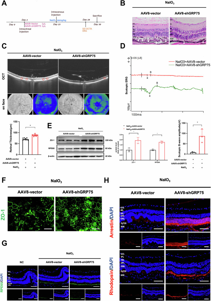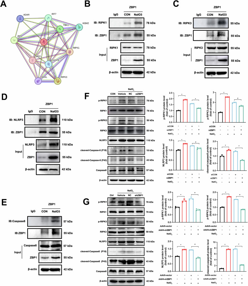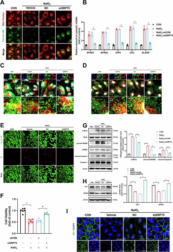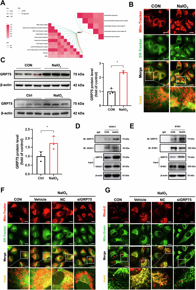 Age-related macular degeneration (AMD) is the leading cause of central vision impairment among the elderly. Geographic atrophy is a defining characteristic of AMD, but the detailed mechanism for massive loss of retinal pigment epithelium (RPE) cells is not fully understood. In this study, we found that Z-DNA binding protein 1 (ZBP1), a sensor for dsDNA, is able to induce RPE cell PANoptosis. Silencing ZBP1 efficiently alleviates RPE degeneration and AMD symptoms. Mechanistically, mitochondrial permeability transition pore (mPTP) opening stimulated by Ca2+ overload can trigger the releasing of mtDNA, which leads to ZBP1 activation and PANoptosis. Importantly, our findings reveal a significant role of aberrant formation of mitochondria-associated ER membranes (MAMs) in AMD. MAMs act as conduits for transferring Ca2+ from the ER to mitochondria through the VDAC1/GRP75/IP3R1 complex. Furthermore, our results indicate that GRP75 O-GlcNAcylation is involved in MAM formation. Genetic suppression of GRP75 attenuates PANoptosis and AMD progression. In summary, our study sheds light on the intricate organelle interplay underlying AMD and presents insights into potential avenues for AMD intervention.
