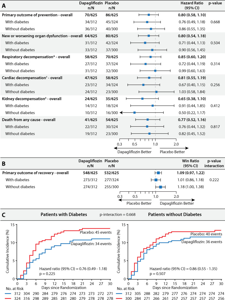 Methods: The DARE-19 trial randomized 1250 patients hospitalized with COVID-19 and cardiometabolic risk factors to dapagliflozin or placebo. T2D was present in 636/1250 (50.9%) of the cohort. Dual primary outcomes were evaluated: prevention (time to new or worsened organ dysfunction or death) and a hierarchical composite outcome of recovery (change in clinical status by day 30). Key biomarkers (serum bicarbonate, estimated glomerular filtration rate [eGFR], hematocrit, and glucose) and safety were assessed in participants with and without T2D during index hospitalization.