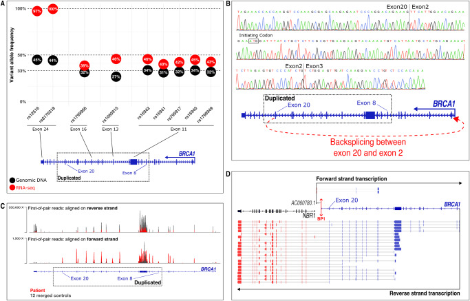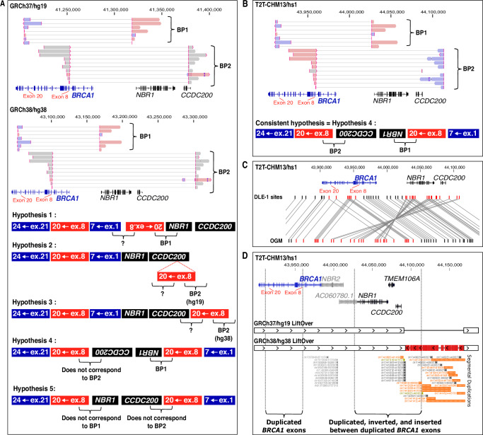Pathogenicity assessment of genetic variants is the cornerstone of genetic counselling. Copy gains of exons are challenging, as pathogenicity depends on the localization of the additional exons. Eight patients form six families carried copy gains of BRCA1 exons 8-20. For appropriate characterization, long-read sequencing aligned on three distinct reference genome assemblies, optical genomic mapping, short-read and long-read RNA sequencing were performed. All patients shared the same pathogenic structural variant, involving a large segment located downstream in the genome. One breakpoint occurred in a region incorrectly annotated in GRCh37/hg19 and GRCh38/hg38. Alignment to the T2T-CHM13/hs1 assembly was therefore necessary for accurate characterization. This rearrangement caused various BRCA1 transcriptomic abnormalities: back-splicing, forward genomic strand transcription by insertion of an ectopic promoter, fusion transcripts with the "Next to BRCA1" gene 1 (NBR1). Our findings underscore the need to combine advanced technologies with the latest genome references to resolve complex rearrangements with significant medical implications.