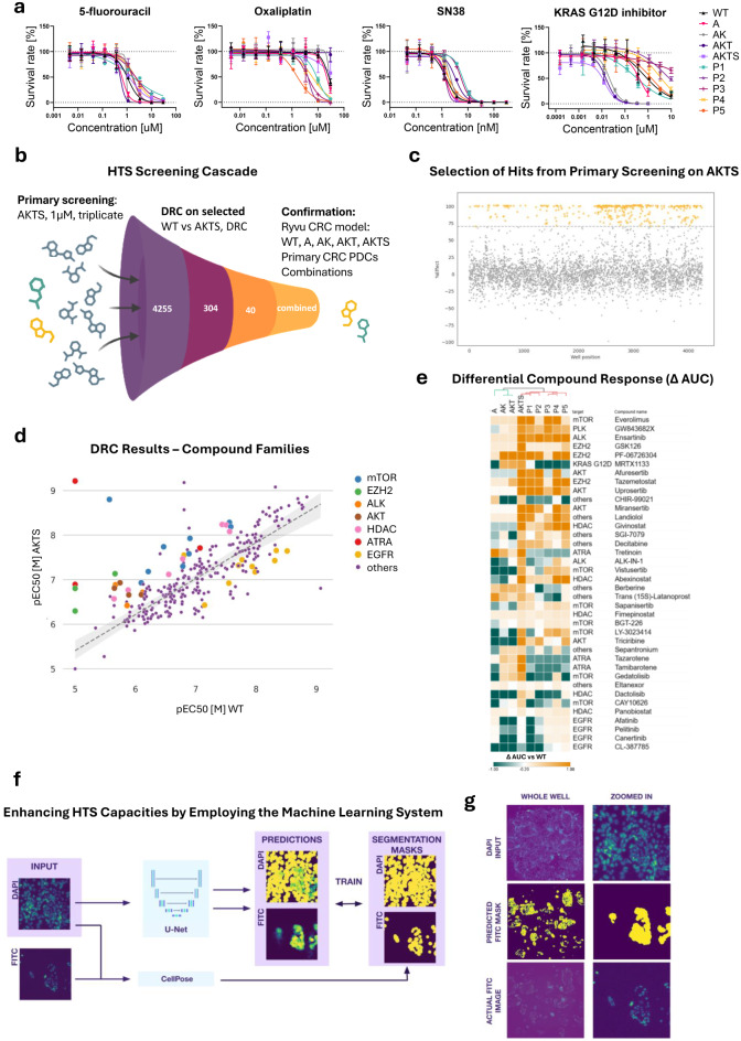 Colorectal cancer (CRC) treatment remains challenging due to genetic heterogeneity and resistance mechanisms. To address this, we developed a drug discovery pipeline using patient-derived primary CRC cultures with diverse genomic profiles. These cultures closely resemble certain molecular characteristics of primary and metastatic CRC, highlighting their promise as a translational platform for therapeutic evaluation. Importantly, our engineered model and patient-derived cells reflect the complexity and heterogeneity of primary tumors, not observed with standard immortalized cell lines, offering a more clinically relevant system, although further validation is needed. High-throughput screening (HTS) of 4255 compounds identified 33 with selective efficacy against CRC cells, sparing normal, healthy epithelial cells. Among the tested combinations, everolimus (mTOR inhibitor) and uprosertib (AKT inhibitor) demonstrated promising synergy at clinically relevant concentrations, with favorable therapeutic windows confirmed across tested patient-derived cultures. Notably, this synergy, revealed through advanced models, might have been overlooked in traditional immortalized cell lines, highlighting the translational advantage of patient-derived systems. Furthermore, the integration of machine learning into the HTS pipeline significantly improved scalability, cost-efficiency, and predictive accuracy. Our findings underscore the potential of patient-derived materials combined with machine learning-enhanced drug discovery to advance personalized therapies. Specifically, mTOR-AKT inhibition emerges as a promising strategy for CRC treatment, paving the way for more effective and targeted therapeutic approaches.