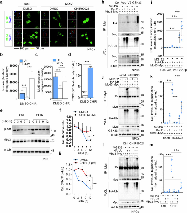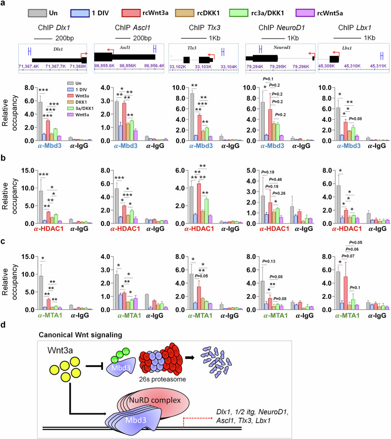 Acquisition of neural progenitor cell (NPC) homeostasis through balancing self-renewal and differentiation is essential for brain development and function. Among the mechanisms controlling these processes, canonical Wnt signaling and the Mbd3-NuRD complex, with prominent suppressive effects on neurogenesis, have been described as crucial parts of the core regulatory circuit. Here we explored Mbd3 as a downstream element of the canonical Wnt signalosomes. Specifically, dynamic modulation of Wnt signaling through activator (Wnt3a) and inhibitor (DKK1) resulted in parallel alterations in β-catenin and Mbd3 expression patterns. Also, overexpression and depletion of GSK3β respectively promoted and attenuated Mbd3 ubiquitination, highlighting that the canonical Wnt cascade promotes Mbd3 stability. Downstream of the Wnt-β-catenin pathway, Mbd3 represses transcription of neurogenesis-associated genes by triggering NuRD complex assembly, thereby promoting NPC stemness. This new Wnt-Mbd3 axis extends the current understanding of the canonical Wnt network in directing neuronal cell-fate determination in NPCs, suggesting this pathway as a potential target for driving neural stem cell reprogramming and neuronal lineage commitment.