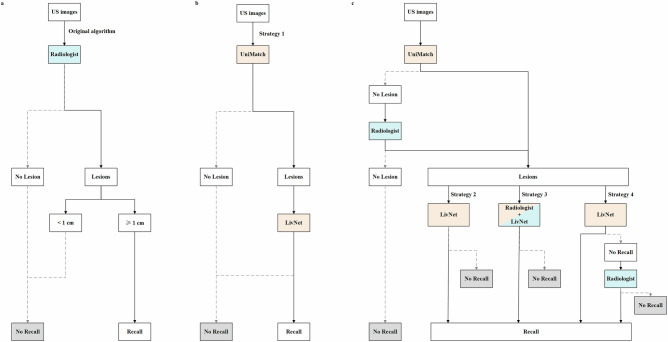 Hepatocellular carcinoma (HCC) ultrasound screening encounters challenges related to accuracy and the workload of radiologists. This retrospective, multicenter study assessed four artificial intelligence (AI) enhanced strategies using 21,934 liver ultrasound images from 11,960 patients to improve HCC ultrasound screening accuracy and reduce radiologist workload. UniMatch was used for lesion detection and LivNet for classification, trained on 17,913 images. Among the strategies tested, Strategy 4, which combined AI for initial detection and radiologist evaluation of negative cases in both detection and classification phases, outperformed others. It not only matched the high sensitivity of original algorithm (0.956 vs. 0.991) but also improved specificity (0.787 vs. 0.698), reduced radiologist workload by 54.5%, and decreased both recall and false positive rates. This approach demonstrates a successful model of human-AI collaboration, not only enhancing clinical outcomes but also mitigating unnecessary patient anxiety and system burden by minimizing recalls and false positives.