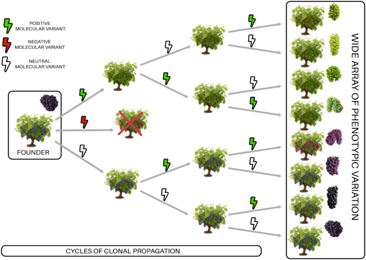 Grapevine has been clonally propagated for thousands of years. Though clonal propagation aims at maintaining varietal identity, somatic mutations and epigenetic modifications accumulated over hundreds to thousands of years lead to intra-varietal diversity. This intra-varietal variation is a very valuable resource in grapevine breeding, as it creates the opportunity to improve important traits related to yield, phenology, stress tolerance, and quality without altering the varietal identity which is extremely important for the industry. Recent advances in genomics, epigenetics, and phenotyping technologies are providing completely new opportunities to gain functional insights into the drivers underlying trait variation and to explore this for accelerated grapevine breeding. This review discusses the interaction between somatic mutations, epigenetic regulation, and emerging breeding technologies. We begin by exploring the phenotypic variation observed within clonal populations across various commercially important varieties, focusing on both agronomic and winemaking-related traits. Next, we examine the extent of genomic and epigenomic variation among clones, highlighting known mutations responsible for somatic variants. We also address how grapevine clonal populations serve as an advantageous model for understanding how genetic and epigenetic variants shape complex trait variation. Given recent advances, we discuss the potential of predictive breeding strategies to accelerate clonal evaluation and how genome editing technologies open new opportunities for targeted genetic improvements without passing through the tedium and unpredictability of clonal selection, driven by natural mutation. Ultimately, these new breeding technologies enable the integration of advanced methods into breeding programmes, optimizing grapevine performance while preserving the unique heritage of historic cultivars.