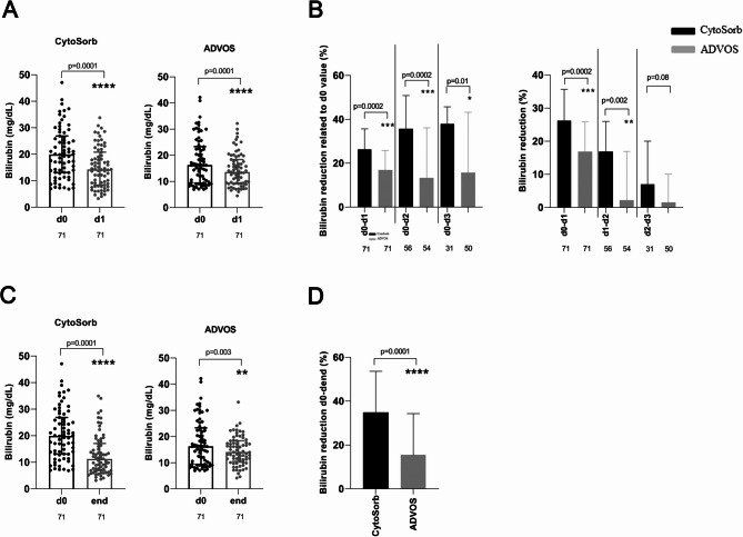Results: The first single sessions of both CytoSorb with CVVHDF and ADVOS were associated with a statistically significant decrease in total serum bilirubin levels (Cytosorb, 20 to 14 mg/dL, p < 0.0001; ADVOS, 16 to 14 mg/dL, p < 0.0001), but the percentage bilirubin reduction was more pronounced for CytoSorb treatment (26% vs. 17%, p = 0.0002). The number of days of treatment was similar for both groups (3 vs. 4, p = 0.07). After completion of therapy, serum levels of total bilirubin had decreased significantly; 19.9 to 11.3 mg/dl (p < 0.0001) in the CytoSorb group and 16.3 to 14.0 mg/dL (p = 0.003) in the ADVOS group. The relative bilirubin reduction was significantly higher after application of CytoSorb than after treatment with ADVOS (35% (IQR 19,54) vs. 15% (IQR - 11;54), p < 0.0001). Regarding patients with ACLF, relative reduction of bilirubin after the first session as well as after the completion of liver support was significantly higher among patients who were treated with CVVHDF and CytoSorb than among those patients who received ADVOS. The relative removal of creatinine and urea nitrogen was significantly higher after ADVOS treatment than after CytoSorb with CVVHDF treatment considering all critically ill patients as well as ACLF patients. Seven-day or in-hospital mortality rates were high among critically ill patients and patients with ACLF in both liver support groups.