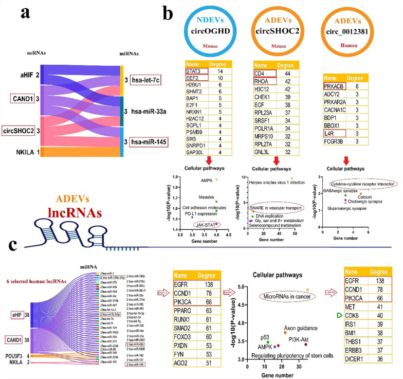 Target evaluation of lncRNAs and circRNAs in BDEVs. a A comprehensive miRNA-target prediction analysis was conducted for three selected circRNAs (circSHOC2, circOGHD, and circ_0012381) and six selected lncRNAs (CAND1.11, lncRNA-NKILA, lncRNA-ATB, lncRNA-aHIF, lncRNA-CCAT2, and lncRNA-POU3F3) with available complete sequences. Particularly, two of these miRNAs, let-7c and miR-145, are also contained in BDEVs. b PPI network was constructed for miRNAs targeted by each circRNA. For circOGHD, the top hub proteins identified are STAT3 and EEF2, with the JAK-STAT signaling pathway showing the most significant relevance. For circSHOC2, the top hub proteins are CD4 and RHOA, with the SNARE vesicular transport pathway showing notable relevance. For circ_0012381, PRKACB and IL4R are identified as key hub, with the cytokine-cytokine receptor interaction pathway showing the most significant relevance. c Common miRNA-target predictions were performed for the six selected lncRNAs. Among these, only four lncRNAs share common miRNA interactions. Notably, CAND1 and aHIF were predicted to target a significant number of 38 miRNAs, among which let-7b, miR-145, miR-190b, and miR-495 have been detected in BDEVs. PPI network constructed for miRNAs targeted by these lncRNAs reveal that EGFR, CCND1, and PIK3CA are three top hub genes. These hub genes are significantly enriched in key cellular pathways, including miRNAs in cancer, axon guidance, and the PI3K-Akt signaling pathway. Interestingly, when focusing on miRNAs involved in cancer, the same three hub proteins (EGFR, CCND1, and PIK3CA) were once again highlighted, emphasizing their crucial role in both cancer-related and neuroinflammatory regulatory networks