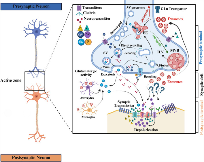 The role of brain-derived exosomes in the synaptic cleft. EVs, such as exosomes, exert various functions within the synaptic cleft, facilitating intercellular communication and potentially impacting synaptic function. They participate in the transmission of signaling molecules, clearance of neurotoxic proteins, modulation of neuroinflammatory responses, and regulation of synaptic development and plasticity. However, their confirmation remains elusive, as depicted by question marks in this illustration. Figure was created using BioRender (BioRender.com) and is used with permission