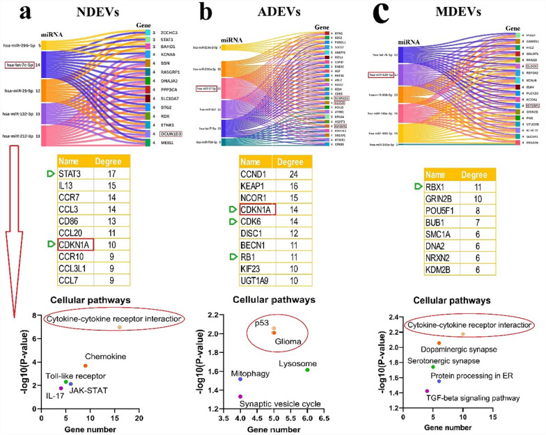Identification of targets of BDEV miRNAs. Common gene targets of miRNAs were predicted in a cell-specific manner, followed by PPI network and cellular pathways analysis. a In NDEVs, five miRNAs targeted 14 common genes, with Let7-c-5p interacting with all of them, while DCUN1D3 was also targeted by ADEV-derived miRNAs. b In ADEVs, six miRNAs targeted 25 common genes, with miR-17-5p interacting with all, while CLOCK and IGF2BP1 were also targeted by MDEV-derived miRNAs. c In MDEVs, six miRNAs targeted 18 common genes, with miR-129-5p interacting with 17 of them. PPI network analysis identified STAT3 as the top hub protein for NDEV miRNAs, and CCND1 emerged as the top hub protein for ADEV miRNAs. CDKN1A is among the top 10 hub proteins for both NDEV and ADEV miRNAs. For MDEVs, RBX1 was the predominant hub protein. Cellular pathways associated with the hub proteins include inflammatory-related pathways predominantly involved in NDEVs (a), glioma-related pathways in ADEVs (b), and neuronal and cytokine-related pathways in MDEVs (c)