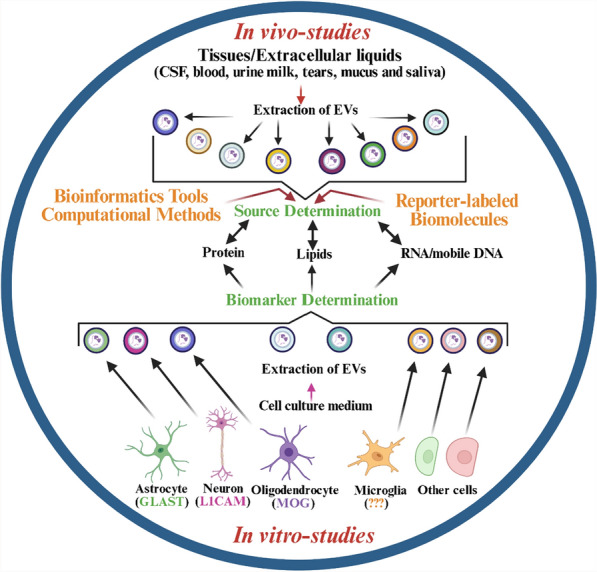 Different methodologies and experiments can be integrated to comprehensively characterize exosomes. The cellular origin of EVs extracted from biological fluids can be determined through bioinformatic and computational analyses, by labeling them in individual cells before release or sorting them according to unique signatures during or after extraction. The signature of cell-specific EVs can be validated in vitro in cultures of primary cells or cell lines. Figure was created using BioRender (BioRender.com) and is used with permission