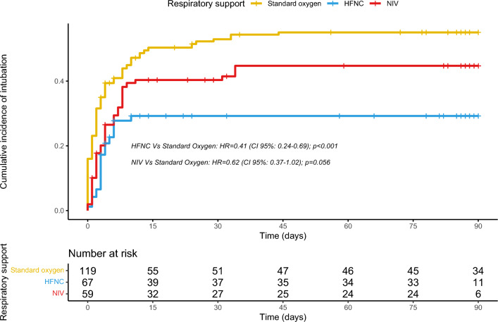 Results: Over the study period, 248 patients with PjP were included in the present analysis. Of those, 70 were treated by HFNC while 118 and 60 received SO and NIV, respectively. HFNC patients had a decreased intubation rate (28.6% versus 45.0% in NIV and 55.4% in SO patients; p = 0.003). When assessing the impact of respiratory management on intubation by IPTW, HFNC remained an independent protective factor (weighted Hazard Ratio (HR) 0.41 (95% CI 0.24-0.69); p < 0.001). While, NIV was not associated with intubation (HR 0.62 (95% CI 0.37-1.02); p = 0.056). Through adjusted survival analysis, long-term corticosteroids treatment (aHR 4.03 (95% CI 2.01-8.08); p < 0.001), Solid tumor (aHR 3.37 (95% CI 1.45-7.86); p = 0.005) and the Sequential Organ Failure Assessment score (aHR 1.24 (95% CI 1.15-1.35); p < 0.001) were found to be independent predictor for death. Initial respiratory support was not associated with survival either in the Cox multivariable analysis or in the IPTW analysis.