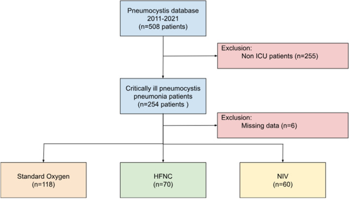 Conclusion: Through this multicenter observational study of severe PjP patients, although oxygenation strategy was not associated with D90 survival, HFNC support appeared to be associated with a lower intubation rate. Further prospective studies are warranted to refine respiratory management in critically ill PjP patients.