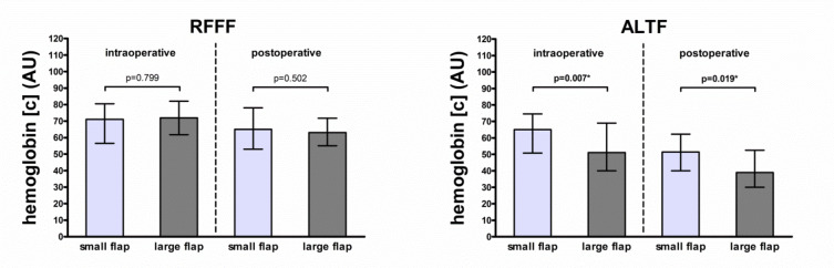 Results: Intraoperative and postoperative hemoglobin concentration at a 2-mm tissue depth differed between small and large ALTFs (65.0 arbitrary units [AU] vs. 51.0 AU, p = 0.007; and 51.5 AU vs. 39.0 AU, p = 0.019). Both differences persisted in multivariable analysis (p < 0.001 and p = 0.012). Other differences were not observed or did not persist in multivariable analysis for RFFFs and ALTFs (all p > 0.05).
