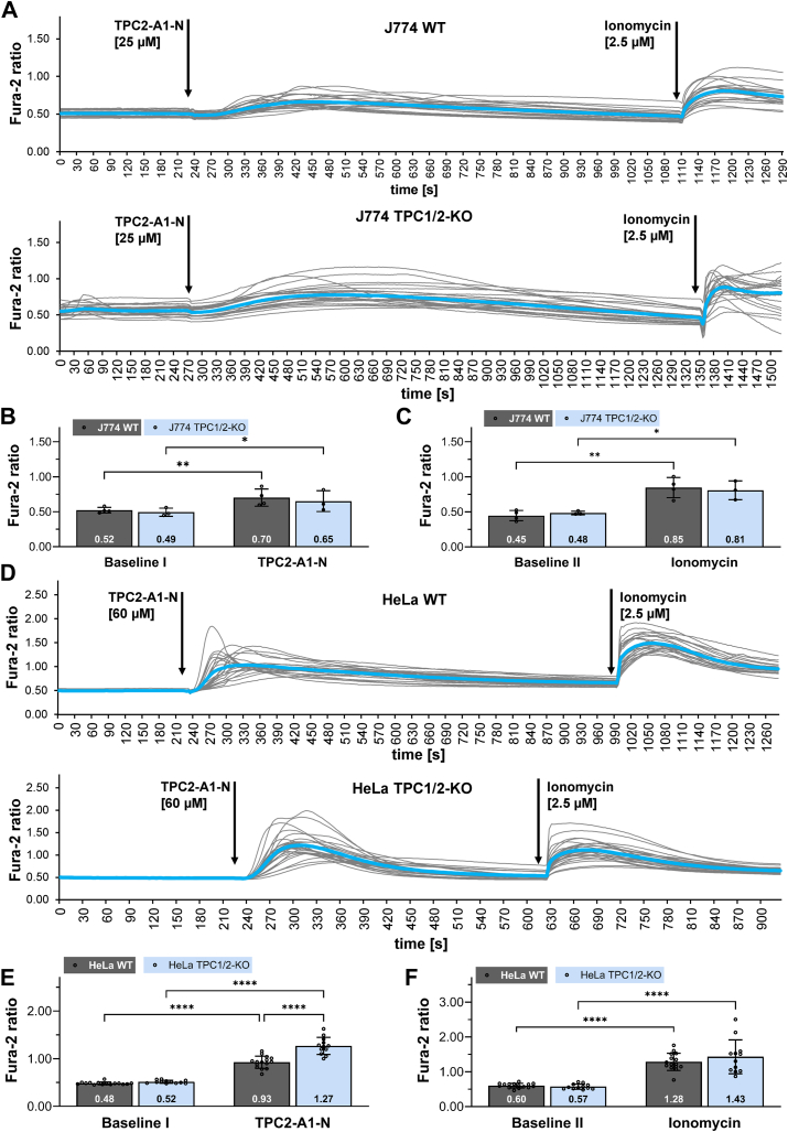 Two-pore channels (TPCs) constitute a small family of cation channels expressed in endo-lysosomal compartments. TPCs have been characterized as important constituents controlling Ca2+-mediated vesicular membrane fusion and fission, thereby regulating intracellular organelle trafficking. Two activators, nicotinic acid adenine dinucleotide phosphate and phosphatidylinositol-3,5-bisphosphate, induce ion flux through TPCs. The membrane-permeable small molecule activators TPC2-A1-N and TPC2-A1-P have been identified and postulated to mimic their action and to discriminate for a preferential selectivity either for Ca2+ or for Na+. This was observed only for TPC2 and was independent of nicotinic acid adenine dinucleotide phosphate-binding proteins. Here, we applied TPC2-A1-N and measured intracellular increase of Ca2+ and Na+ in mouse embryonic fibroblast, HeLa, and J774 cells. TPC2-A1-N did not only increase Ca2+ levels in WT but also in all cells with genetically inactivated TPCs. Depletion of Ca2+ from the endoplasmic reticulum (ER) via thapsigargin caused a massive reduction of the TPC2-A1-N induced Ca2+ elevation in all cell lines, indicating that ER plays a key role in this context. Furthermore, our results point to an inositol triphosphate receptor-independent TPC2-A1-N mediated Ca2+ release. Ca2+ depletion from ER was also observed by using an ER-targeted GCaMP6 construct. TPC2-A1-N also raised Na+ levels in mouse embryonic fibroblast cells deficient for TPC1 and TPC2. In summary, our results suggest that TPC2-A1-N induced Ca2+ and Na+ signals are independent of any TPC and that ER represents the major source of Ca2+.