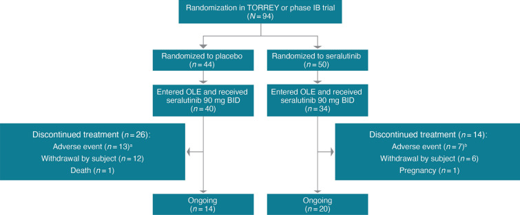 Results: At OLE entry, 34 patients continued on seralutinib (Seralutinib Continued); 40 switched from placebo to seralutinib (Placebo Crossover). Common TEAEs were headache (28.4%), coronavirus disease (COVID-19) (27.0%), and cough (23.0%). TEAEs led to seralutinib discontinuation in 20 (27.0%) patients; cough was the reason in 9/74 (12.2%). In the Seralutinib Continued group, median change in PVR from TORREY baseline to weeks 24 and 72 was - 94 dyne·s/cm5 and - 143 dyne·s/cm5, respectively (n = 28). In the Placebo Crossover group, corresponding values were - 32 dyne·s/cm5 and - 56 dyne·s/cm5, respectively (n = 27). Continued improvement in 6-min walk distance was observed. N-terminal pro-brain natriuretic peptide (NT-proBNP) significantly decreased with seralutinib during TORREY and remained stable throughout the OLE. After an increase in TORREY, NT-proBNP levels in the Placebo Crossover group nearly returned to TORREY baseline at week 72.