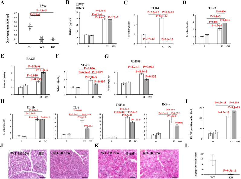 Methods: E-MNCs were transplanted into radiation-damaged mice SGs, and changes of TLR4/RAGE expression were observed. Furthermore, the activation of downstream signals was investigated in both intact SGs and cultured SG epithelial cells after irradiation. Subsequently, TLR4-knock-out (KO) mice were employed to examine how HMGB1/TLR4/RAGE signaling affected damage progression.
