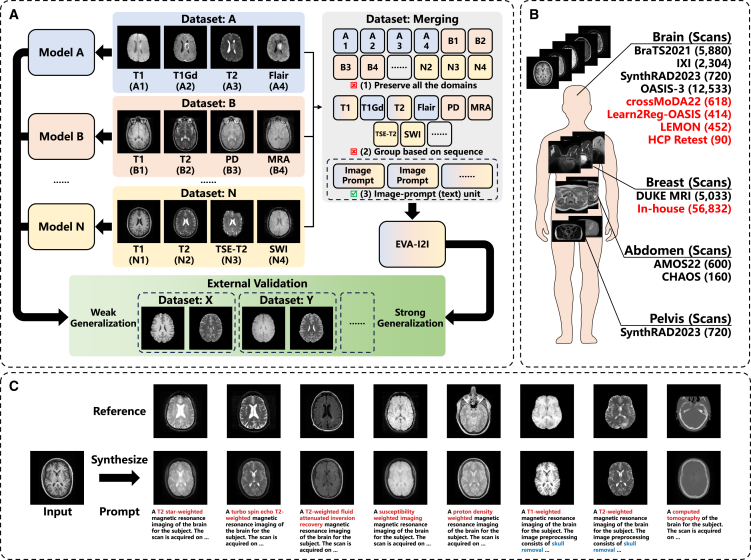 The growing availability of public multi-domain medical image datasets enables training omnipotent image-to-image (I2I) translation models. However, integrating diverse protocols poses challenges in domain encoding and scalability. Therefore, we propose the "every domain all at once" I2I (EVA-I2I) translation model using DICOM-tag-informed contrastive language-image pre-training (DCLIP). DCLIP maps natural language scan descriptions into a common latent space, offering richer representations than traditional one-hot encoding. We develop the model using seven public datasets with 27,950 scans (3D volumes) for the brain, breast, abdomen, and pelvis. Experimental results show that our EVA-I2I can synthesize every seen domain at once with a single training session and achieve excellent image quality on different I2I translation tasks. Results for downstream applications (e.g., registration, classification, and segmentation) demonstrate that EVA-I2I can be directly applied to domain adaptation on external datasets without fine-tuning and that it also enables the potential for zero-shot domain adaptation for never-before-seen domains.