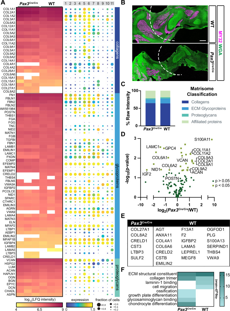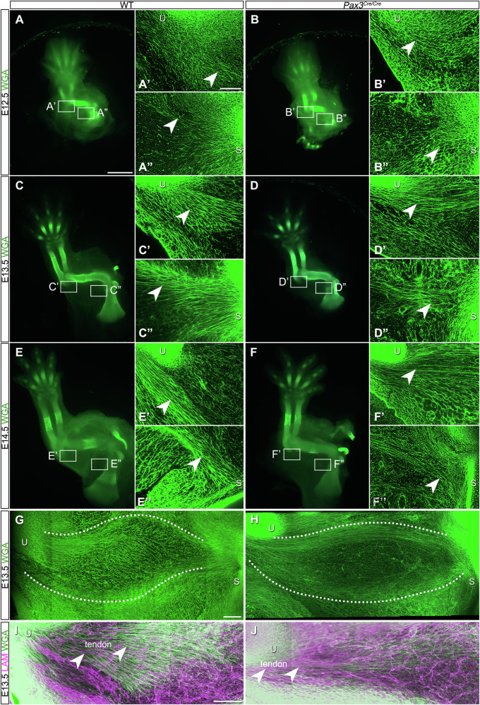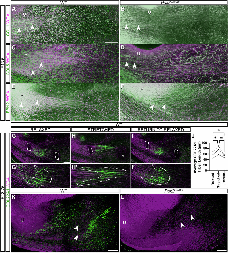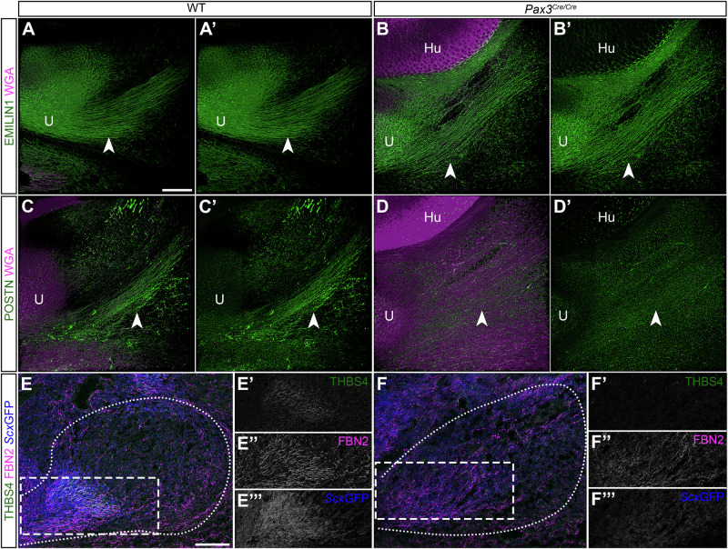 The development of a functional musculoskeletal system requires the combination of contractile muscle and extracellular matrix (ECM)-rich tendons that transmit muscle-generated force to bone. Despite the different embryologic origins, muscle and tendon integrate at the myotendinous junction (MTJ) to connect across this interface. While the cell-cell signaling factors have received considerable attention, how the ECM links these tissues remains unclear. Here, we show the 3D distribution of ECM during forelimb development in wildtype (WT) and muscle-less Pax3Cre/Cre mice. At E12, prior to MTJ integration, an aligned ECM is present at the presumptive insertion of the long triceps into the ulna. Tendon-like and muscle compartmentalization structures still form when muscle is knocked out; however, MTJ-specific ECM is not observed when muscle is absent. Our results show that the architecture of the muscle-tendon unit is established independent of muscle, but muscle is needed for the proper assembly of ECM at the MTJ.