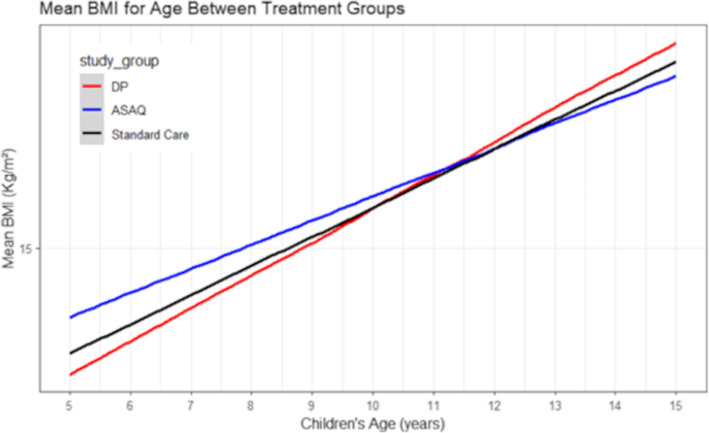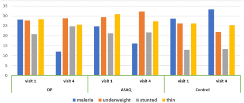 Findings: At baseline, the prevalence of malaria was 27%. The prevalence of being underweight among children of ≤ 10 years was 23%. Among all children surveyed at baseline, 21% were stunted and 28% were either thin or severely thin. The odds of stunting were 78% higher (AOR = 1.78, 95%CI = [1.36, 2.33], P < 0.001) among children who had malaria compared with those who did not have malaria. Children from low socioeconomic status (SES) had higher odds of being underweight (AOR = 1.50, 95%CI = [1.13,2.01], P = 0.006) compared with their high SES counterparts. During the intervention, change in mean weight, height, and BMI over time as estimated from age-treatment interaction was not significantly different in the dihydroartemisinin-piperaquine (DP) and Artesunate amodiaquine (ASAQ) treatment groups compared with the control group.