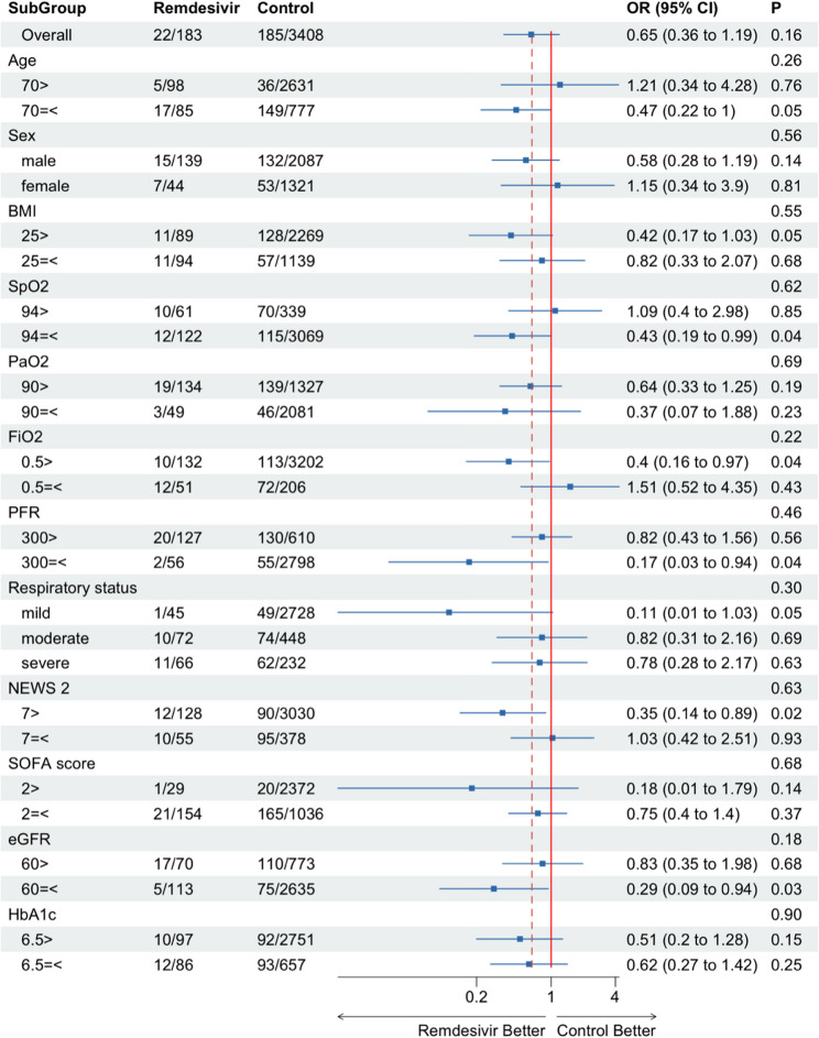 Results: The overlap weighting (OW)-adjusted odds ratio (OR) for mortality in overall cohort, mild cases without supplemental oxygen, moderate cases requiring supplemental oxygen, and severe cases requiring ventilation was (OR, 0.65 (95% confidence interval (CI), 0.36-1.19; P = 0.16), 0.11 (95% CI, 0.01-1.03; P = 0.05). 0.82 (95% CI, 0.31-2.16; P = 0.69), and 0.78 (95% CI, 0.28-2.17; P = 0.63), respectively. A trend toward improvement in mortality was observed in respiratory indicators, such as SpO2 ≥ 94% (OR, 0.43; 95% CI, 0.19-0.99; P = 0.04), oxygen support with FiO2 < 0.5 (OR, 0.40; 95% CI, 0.16-0.97; P = 0.04), and PFR ≥ 300 (OR, 0.17; 95% CI, 0.03-0.94; P = 0.04). Subgroup analyses indicated improved mortality in patients with an estimated glomerular filtration rate (eGFR) of > 60 mL/min per 1.73 m2 (OR, 0.29; 95% CI, 0.09-0.94; P = 0.03), with a p-value for interaction of P = 0.18.