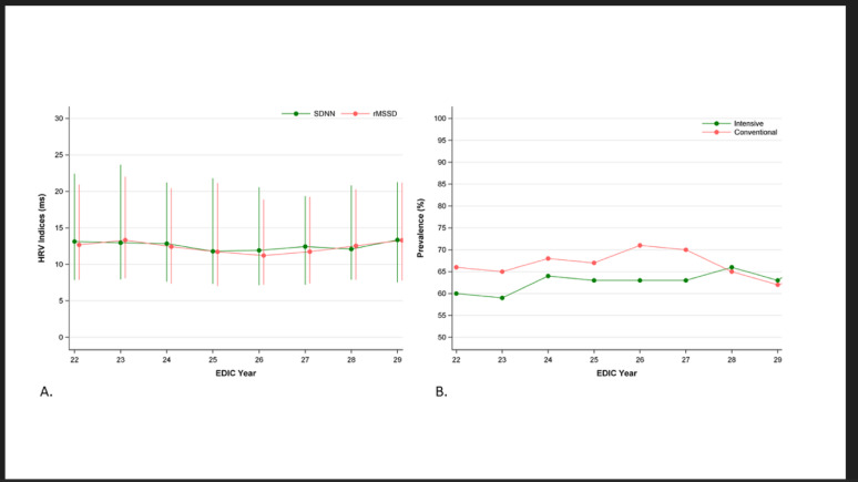 Background: To describe longitudinal prevalence and risk factors associated with cardiovascular autonomic neuropathy (CAN), defined by heart rate variability (HRV) indices, and evaluate the impact of CAN on cardiovascular disease (CVD), in adults with type 1 diabetes (T1D) from the Epidemiology of Diabetes Interventions and Complications (EDIC) study.