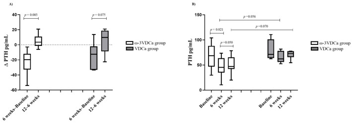 Background/Objective: In patients with acute lymphoblastic leukemia (ALL), it has been demonstrated that the treatment has a negative effect on bone health. The n-3 polyunsaturated fatty acids (LCPUFAs-ω3) may attenuate bone resorption. We evaluated the effects of LCPUFAs-ω3, vitamin D, and calcium supplementation on bone turnover markers and changes in vitamin D concentrations during 6 weeks of supplementation and during 6 weeks of post-intervention follow-up in pediatric patients with ALL. Methods: Thirty-six pediatric patients with ALL were randomly assigned to the ω-3VDCa group (100 mg/kg/d LCPUFAs-ω3 + 4000 IU vitamin D + 1000 mg calcium) or the VDCa group (4000 IU vitamin D + 1000 mg calcium) for 6 weeks. Blood samples were collected to determine 25(OH)D, PTH, ICTP, and TRAP-5b (biomarkers of bone resorption) and osteocalcin (OC, a biomarker of bone production) levels at baseline, 6 weeks, and 12 weeks after supplementation. The 25(OH)D analysis was performed using ultra-high-performance liquid chromatography coupled to a mass spectrometer, and PTH and bone turnover markers were measured by ELISA. Results: The 25(OH)D concentration increased in both groups (ω3VDCa group: 19.4 ng/mL vs. 44.0 ng/mL, p < 0.0001; VDCa group: 15.3 ng/mL vs. 42.8 ng/mL, p = 0.018) and remained significantly higher at 12 weeks. At 12 weeks, ICTP showed lower concentrations in the ω-3VDCa group than in the VDCa group (0.74 ng/mL vs. 1.05 ng/mL, p = 0.024). Conclusions: Combined omega-3 and 4000 IU vitamin D supplementation for 6 weeks had a positive effect on bone health, as indicated by serum ICTP, with no effect on serum 25(OH)D levels over vitamin D supplementation alone.